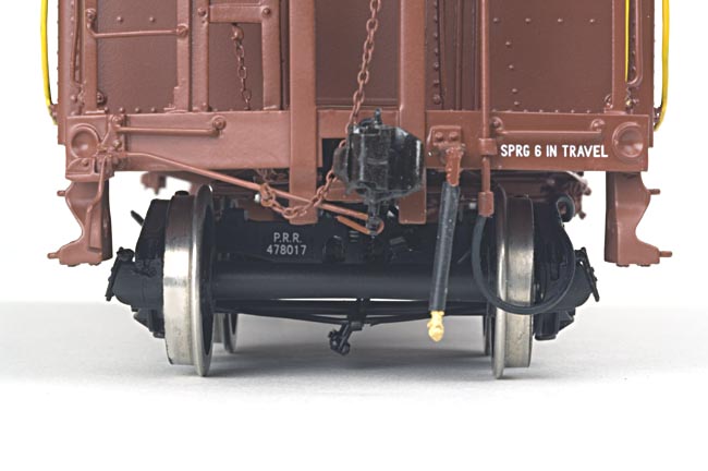 A closer view of the end sill detailing, notice the antenna cable lead to the truck side frame. The scale coupler is interchangeable with a traditional Kadee unit.