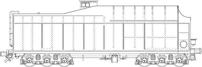 The Version 22-C (above) tenders were rebuilt and modernized for use with road numbers 1213-1234 (excluding 1223). This tender is almost identical to those used with the N&W Y6a except for the Commonwealth trucks. The side sheeting of the tank is built up in three layers and this detail is included on the model. Notice the frame mounted brake cylinder located between the front and rear trucks.