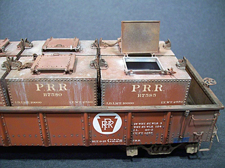 6/28/13 - Some may have noted on my show schedule that the O Scale Nationals had been listed as a tentative event in terms of attendance. Unfortunately commitments to efforts in Korea precluded me from making the trip east. I'm hoping that the convention is a huge success and I will certainly miss being there. Apologies to anyone that was hoping to meet with me there! A couple of months ago I posted some examples of weathered models done by Lee Turner on this page and elsewhere. I want to share a couple of preview shots of Lee's latest efforts with a Kohs & Company model, one of our PRR G22b gondolas with containers. What was particularly striking to me was the underbody weathering detail that correlates so well with the feature detail on the model, the streaking adjacent to the screen areas and so forth. This is a prime example of a weathering 'artist'. Photos of the completed model will be posted in the next few days, but I was so excited about this model, I had to share this preview. The good news for anyone interested in model weathering is that Lee is taking his modeling efforts full time and will be available to work closely with anyone interested in having their models painted and or weathered. It may be a bit foolish to share this information as I may never be able to get another model done for myself, but as with all of my efforts in promoting the work of others, I would like to see Lee Turner succeed to the new degree that he is now aspiring in expanding his efforts. If you would like to contact Lee for further information you may do so using the following E-mail address: lehighvallee@aol.com