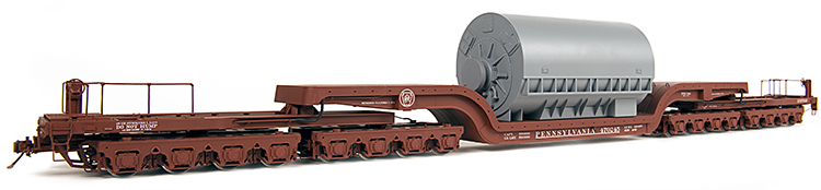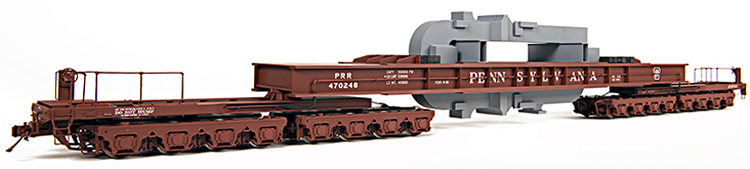 The 'Queen Mary', officially known as the Pennsylvania FD-2 class flat car (sample model shown above), is a truly unique piece of equipment, there was only one and it is currently on display in Altoona, Pennsylvania where it was originally built. Created by the Altoona Car Shops using all welded steel construction in 1952, the FD-2 was capable of handling 500,000 pound loads which typically consisted of Westinghouse turbo-generators. When built, it was the largest piece of rolling stock in the world and when loaded to capacity, it weighed approximately 1,000,000 pounds and required special orders for all movements. Later in the decade, United Engineering & Foundry Company built a special carbody for use with the truck assemblies from the FD-2 to be used for shipping a rolling mill housing that weighed more than 442,000 pounds. The FW-1 (sample model shown below) was six (6) inches shorter than the FD-2 in overall length. The carbody was later purchased by the 'Pennsy' and used interchangeably with the drop-center carbody for a variety of shipments until the car was retired. The FD-2 and FW-1 both routinely traveled off-system and remained in service through the Penn Central and Conrail years of operation. At over thirty inches in length and running on thirty-two ball-bearing equipped journals, these two models make for most impressive O scale models. The truck units are fully articulated allowing for operation on tight radius curves, with the only concern being the inside overhang of the carbody. Taking into consideration the positioning of the carbody relative to the truck assemblies, the inside overhang is approximately the same as that of a scale 80' passenger car. Our scale miniatures are offered in multiple paint schemes appropriate for the Pennsylvania, Penn Central and Conrail Railroads. The carbodies are not interchangeable due to detail variations between the two types. In addition to the cars, scale loads that replicate those seen on the prototype photo pages will be offered separately. For complete details on the versions that are being offered, please refer to the downloadable order form that can be found the project download page. |