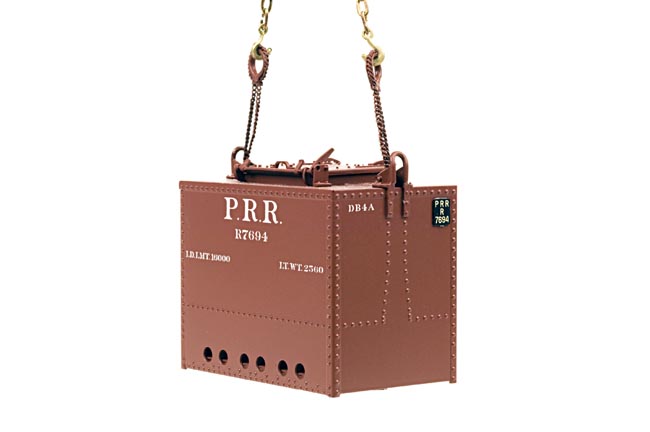 A view of one of our DB4a containers suspended by it's lifting chains which hold the bottom doors closed. The container construction is consistent with the level of detail used on our carbodies, all rivet detail is punched, not etched.