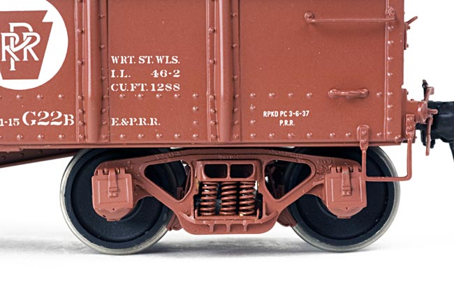A closer view of the carbody construction and truck assembly highlight the fact that no detail has been left out of our production models. From the prototypical pressed side stakes to the punched rivet detail, every effort has been made to make these models as accurate as possible. As is the case with all of our rolling stock, the G22b rides on ball-bearing equipped trucks.