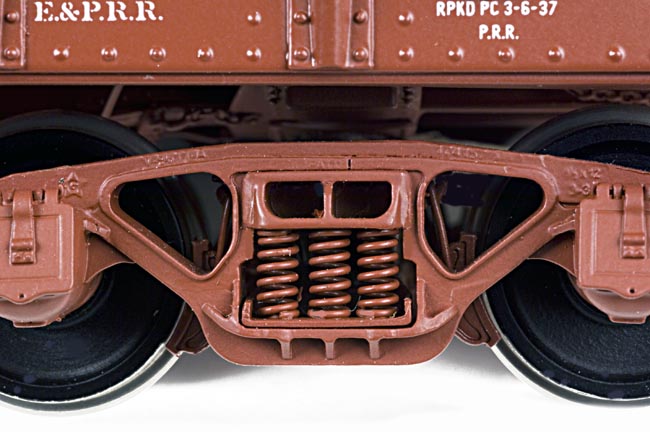 A closer view of the truck side frame shows the raised cast lettering and data. It should be noted that the journal box lids also open.