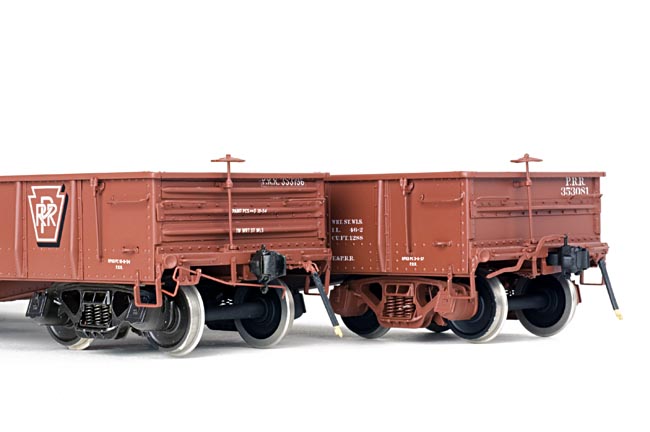 A comparison of the two basic end styles, the 'late' on the left and the 'early' on the right. Note that the 'late' style has three (3) stiffening ribs on the carbody end versus only one (1) on the 'early'. The later G22b's also used a rotary uncoupling device on the coupler mechanism while the 'early' used the very common lift-bar style of mechanism. As is the case with all of our rolling stock, ourG22b's are equipped with scale operating brass couplers.