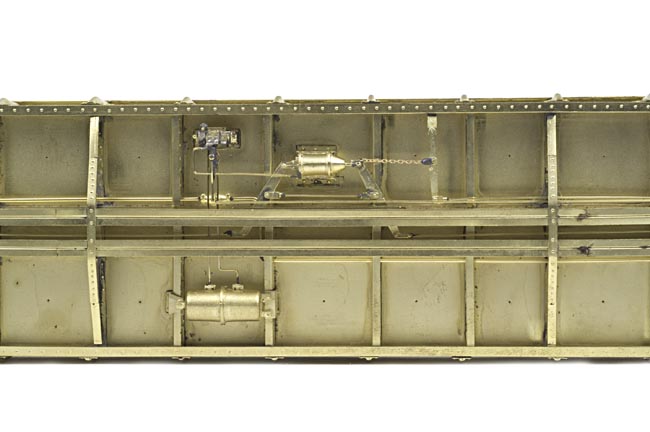 A close up view of the underside showing the brake hardware and plumbing. The construction of the car is totally prototypical from the center sill and cross braces to the truck bolsters.