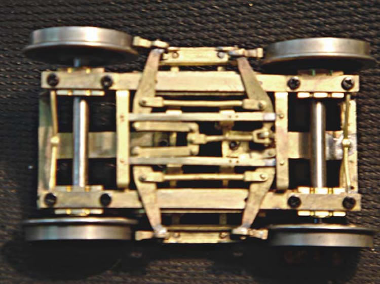 An underside view of the lead truck showing the brake rigging and components, you can also see the bearing boxes which house miniature ball-bearings that the lead truck axles ride on. All of the fasteners used at this point in the development are temporary and will be replaced with scale type fasteners |