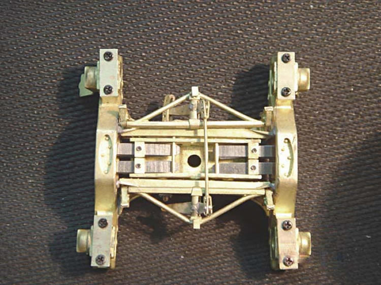An underside view of a nearly complete tender truck is shown above minus the wheelsets and axles. The truck has complete brake detail of course, but it also has real fabricated leaf springs housed in the center bolster and they are functional just as the springs in the locomotive lead truck are. All of the fasteners used at this point in the development are temporary and will be replaced with scale type fasteners