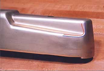 The most misunderstood or overlooked aspect of the body shell design are the contours highlighted by the colored lines in the image above. There are two radii at this point, an outer (blue) and an inner (red). The inner radius forms an angular highlight that is not noticed by most unless it is reflecting direct light. This contour is the natural result of the convergence of several compound surfaces. If you compare the same area in the lower prototype image, you will see the same contours present. |