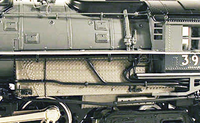 This closeup of the firebox area highlights one of the most complex parts created for our Challenger. What looks to be a flat sheet of brass with some holes is in fact much more complicated than that. Again we have gone to a far greater extent than any other builder/importer is creating the most prototypical model possible, The 'flat' sheet actually has multiple contours rolled into it, the staybolt detail was created by combining the photo-etch process with the punching process, the secondary air openings have flanged edges, the larger flexible staybold detail is created by soldering very small individual castings in scores of locations on the sheet and the circulator locations are pressed and then punched to receive additional casting details. Our Challenger has five different configurations of this part so that each of the eight versions is correctly modeled.