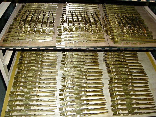 Another view showing the remnants of material that is left after as many frame rails as possible have been cut from the brass sheets. The remnants will be recycled in an effort to save on cost as much as possible. All of the raw materials are either brought in from the United States or Japan to ensure uniform material quality.