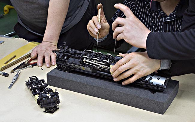 Just as with the locomotives, the tenders needed to be test assembled following painting to ensure proper functioning of the equalized suspension. In the photo below you can see just how complex the underside of our 25-C tenders really are.