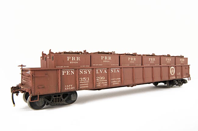 | Version #1 Pennsylvania Railroad G22b class gondola w/DB4 containers (our medium weathering) with an overall 'dusting' and water streaking. Each individual container is weathered separately and the car body is weathered on the inside as well. A very subtle, but realistic prototypical appearance. | ||